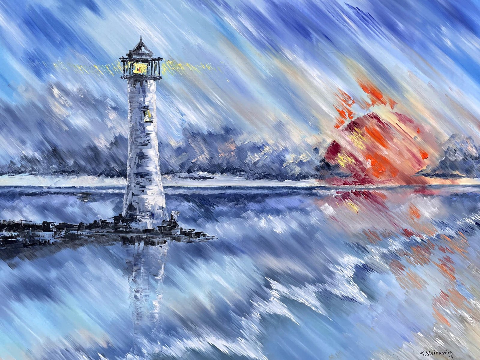 The painting is sold framed ready to hang. Wooden floating frame can be white or black on your choice.